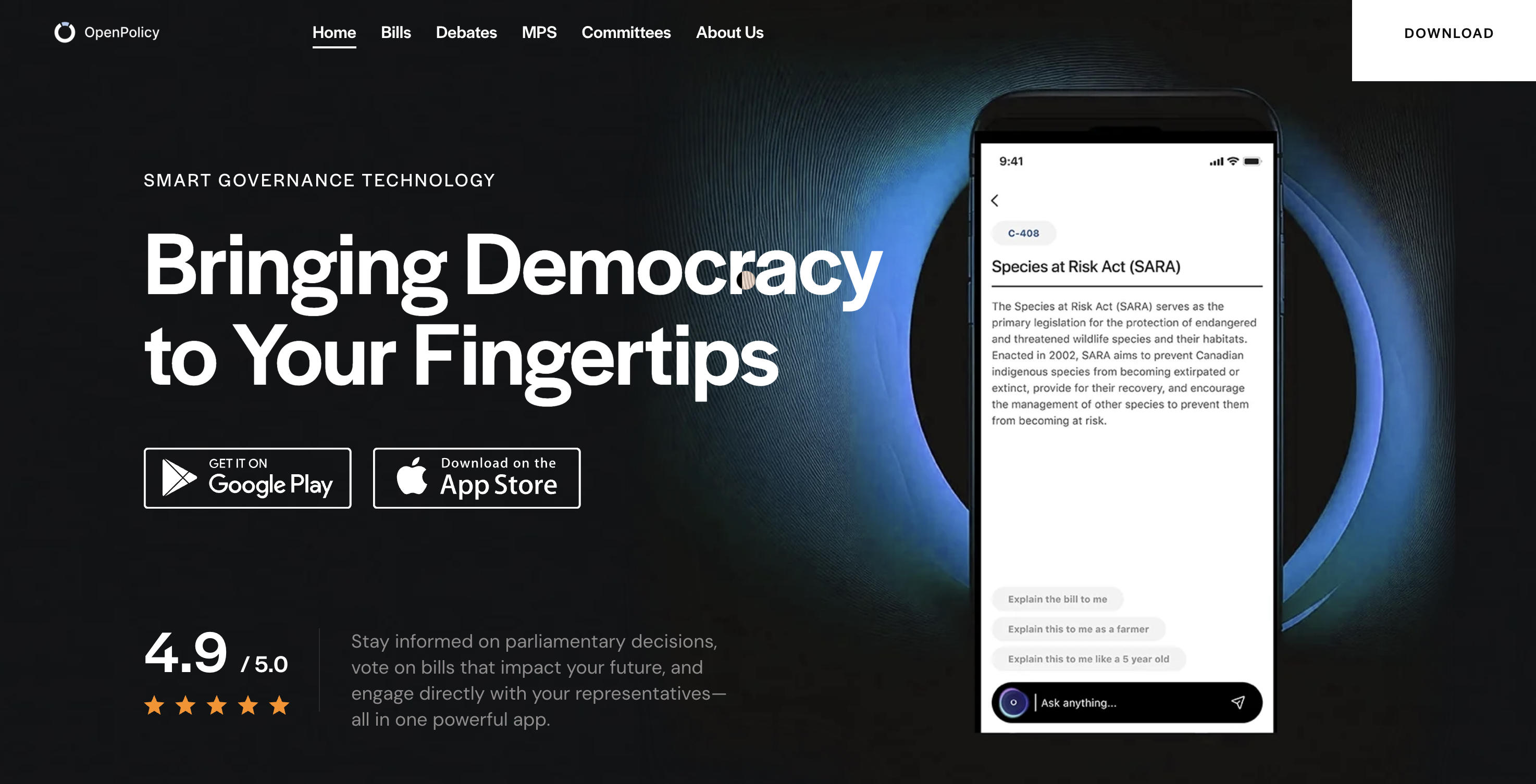 Empowering Canadians to engage with governance in real time. OpenPolicy offers access to parliamentary bills, citizen voting on policies, and direct interaction with representativesall powered by AI for transparency and ease. Shaping the future of democracy, one vote at a time.