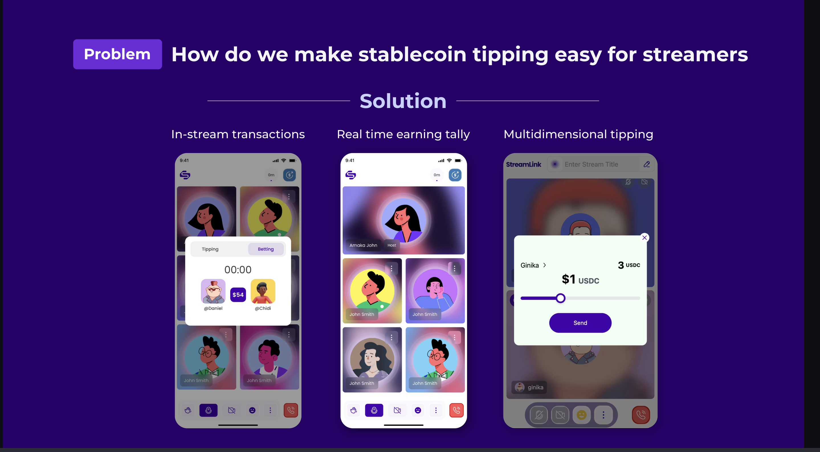 StreamLink is a live streaming application integrated with the Solana blockchain. It allows viewers to perform real-time transactions during a live stream including sending stablecoin tips (like USDC) directly while watching. This creates a seamless blend of entertainment and blockchain-based interaction